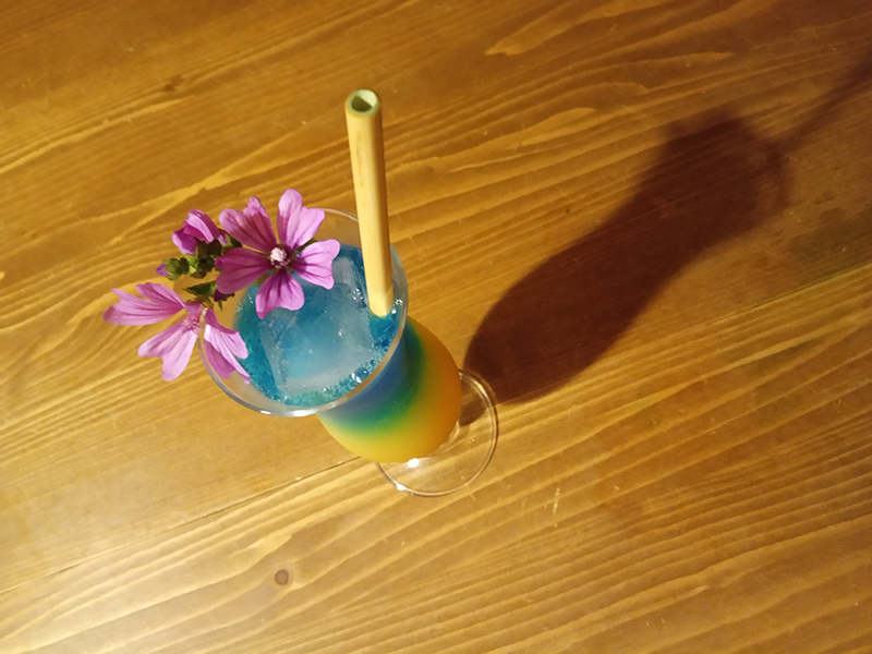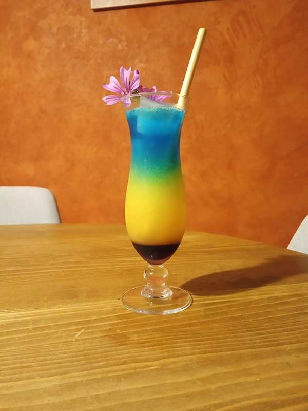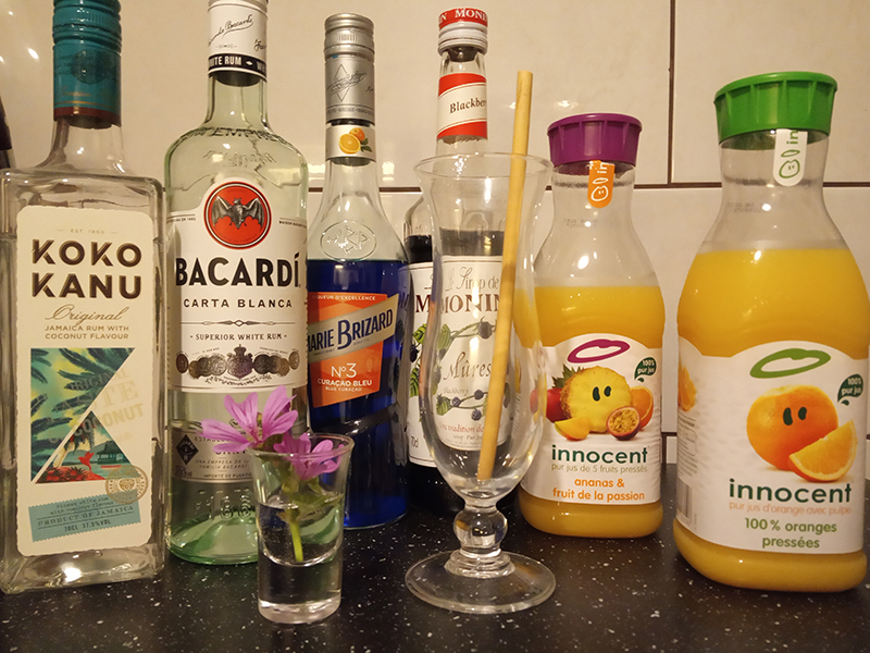 bottom of the glass with blackberry syrup Monin 3 cl Koko Kanu Rum 4,5 cl pineapple/passion fruit juice Innocent4,5 cl orange juice Innocent1,5 cl Rum – Bacardi Carta Blanca 1,5 cl Blue Curaçao Marie Brizard