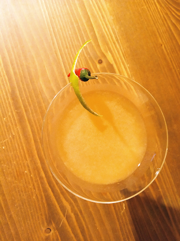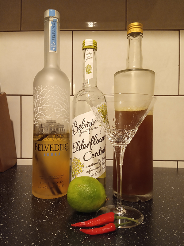 Slight variation on the Salvatore Calabrese’s recipe “Spicy Fifty”. 5 cl homemade vanilla infused Belvedere vodka 1,5 cl Elderflower cordial – Belvoir1,5 cl Lime1 cl homemade elderflower sugar syrupa hint of red jalapẽno chili pepper