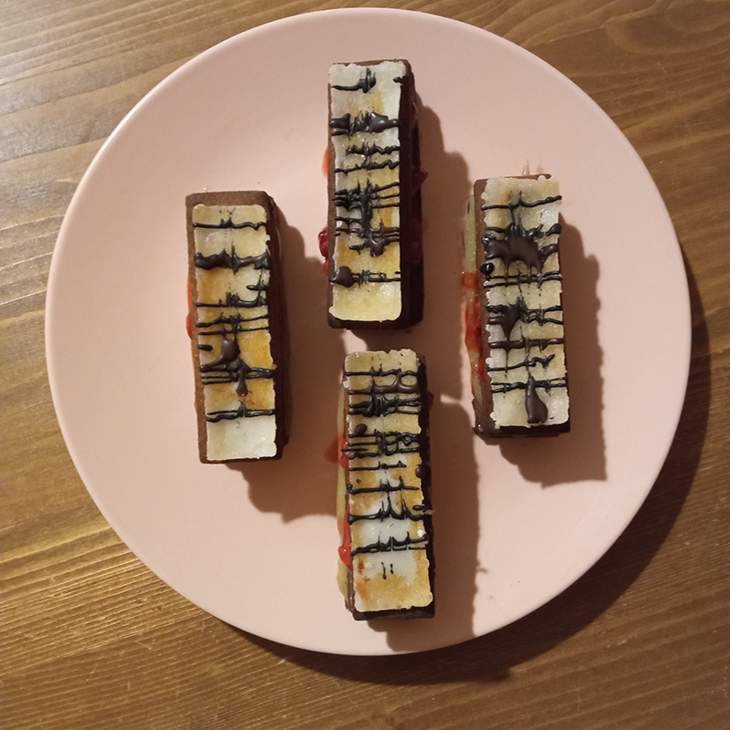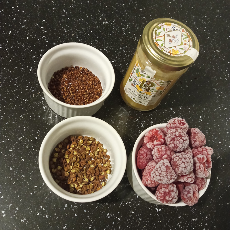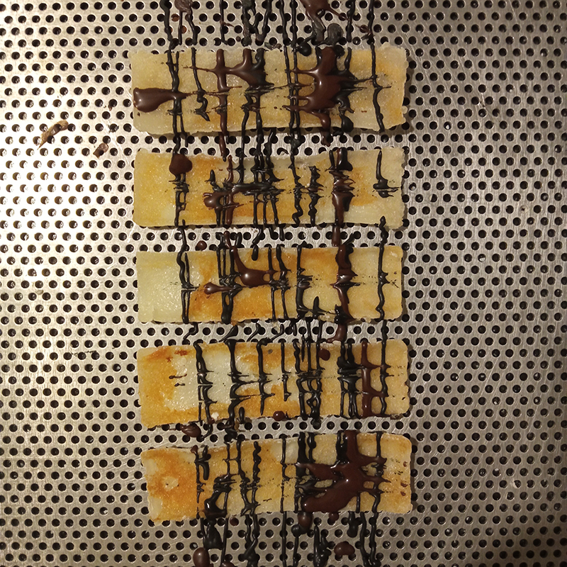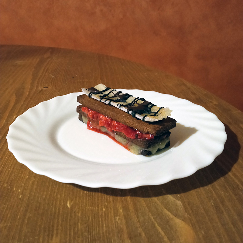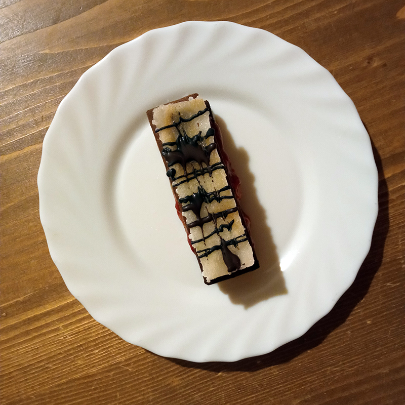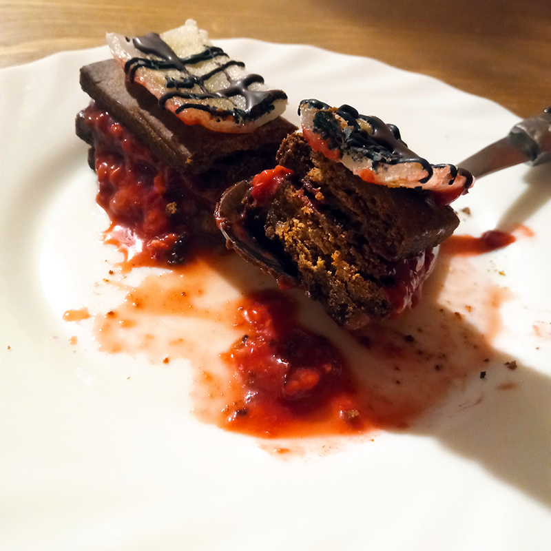 Layered pastry : rice flour, glutinous rice flour, icing sugar, chocolatebutter, coconut blossom sugar, muscovado sugar, chestnut flourfruit sauce : frozen raspberries, sansho berries, maniguettewhite nougat cream – Le Roy René