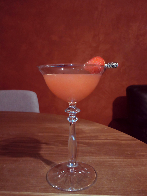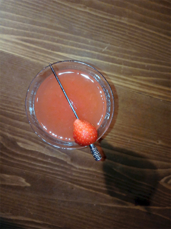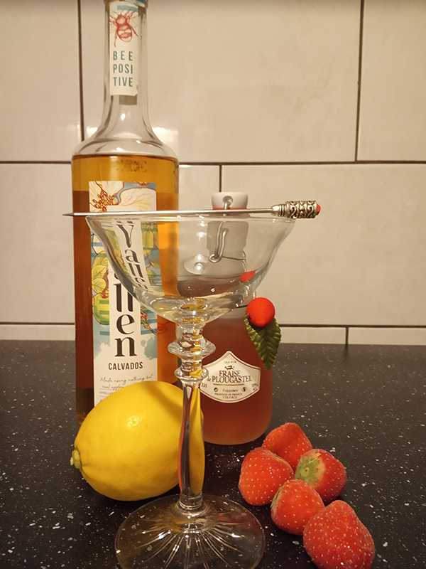 Variation on the "Jack Rose" 4 cl Avallen Calvados2 cl Lemon1,5 cl Liqueur de Fraise de Plougastelsome muddled Strawberries