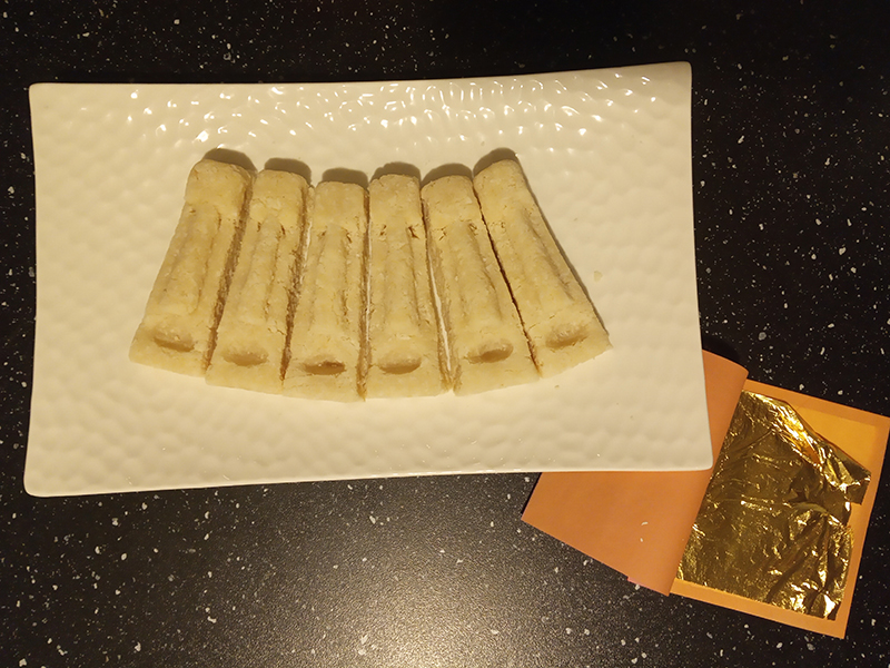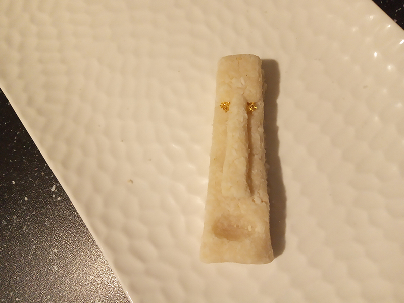 - garnish : marzipan Tiki head [coco + almond] eyes with edible gold leaf.