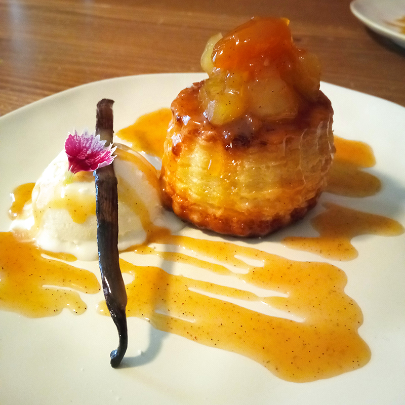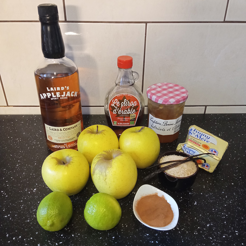 Puff pastry, Golden apples, maple syrup, Isigny butter, cinnamon, sugar, vanilla, peach-apricot jam, lime, Laird’s Applejack