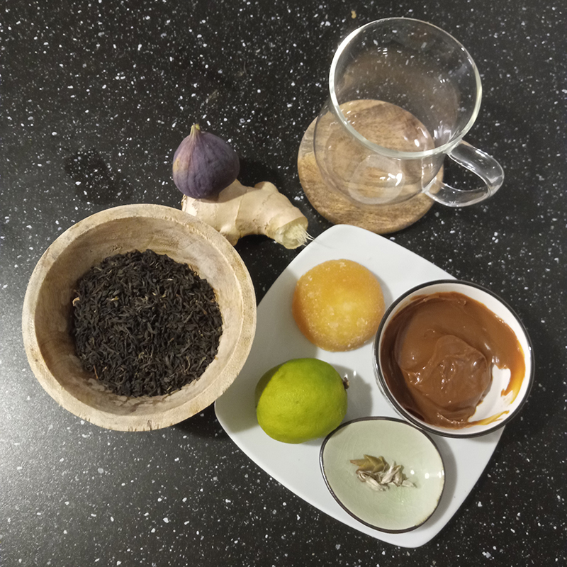 a variation of Karak tea (without cardamom) : Kenya Marynin black tea, milk jam, ginger, lime, palm sugar, Ha Giang & Tay Con white wild tea tree buds