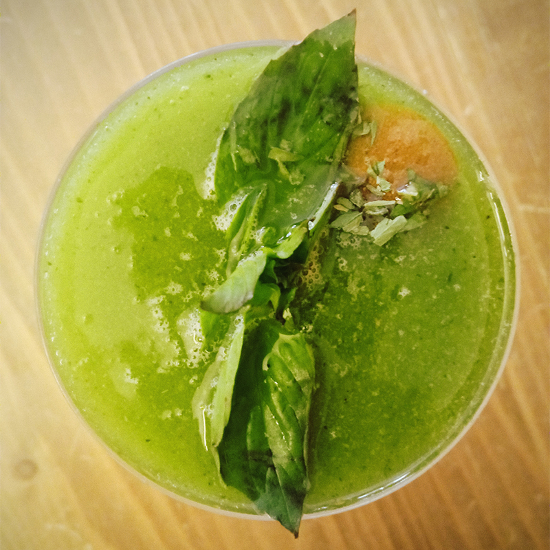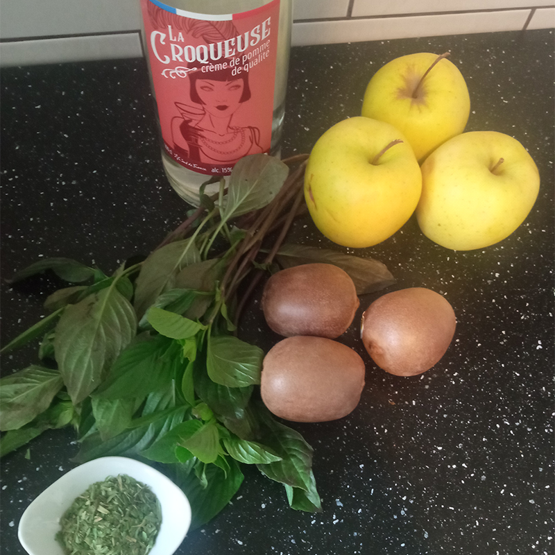 Apple, kiwi, mango, Thai basil, tarragon, “La Croqueuse” apple liqueur