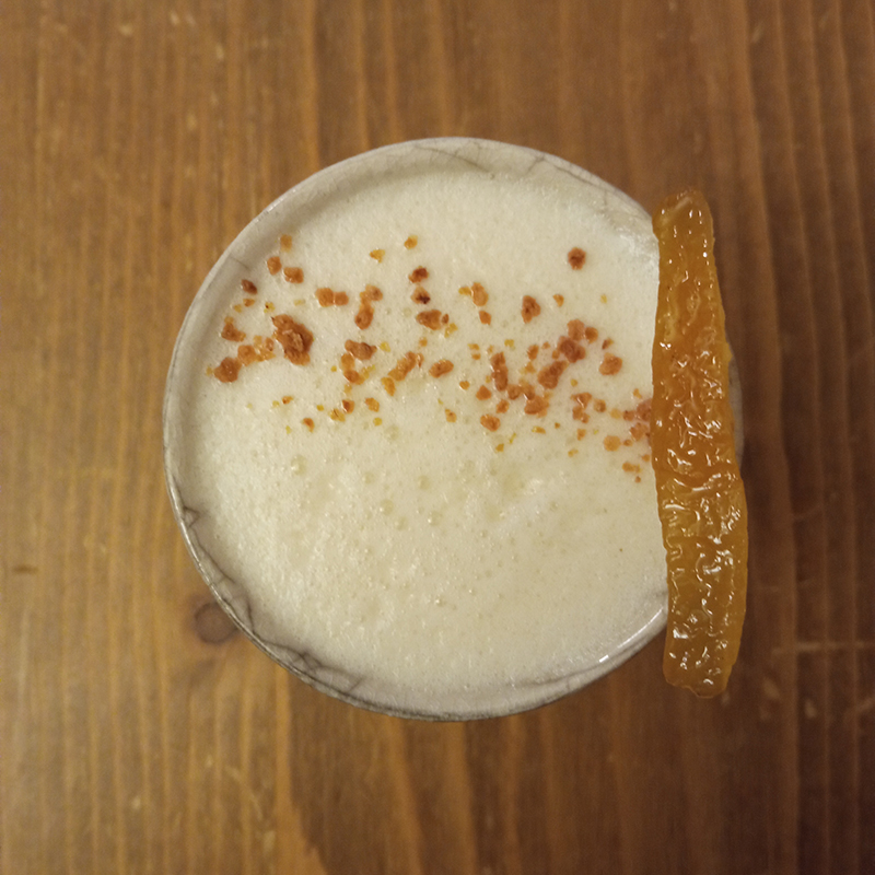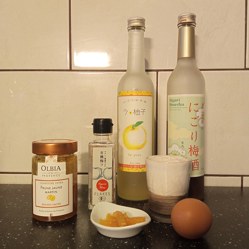4 cl Umeshu – Nigori2 cl “La” Yuzu Liqueur – Godo Shushei1 barspoon Prune Jaune Martin – Olbiaeggwhitegarnish : Orangette de Yuzu & crispy ume plum flakes – Yasashi Umeya